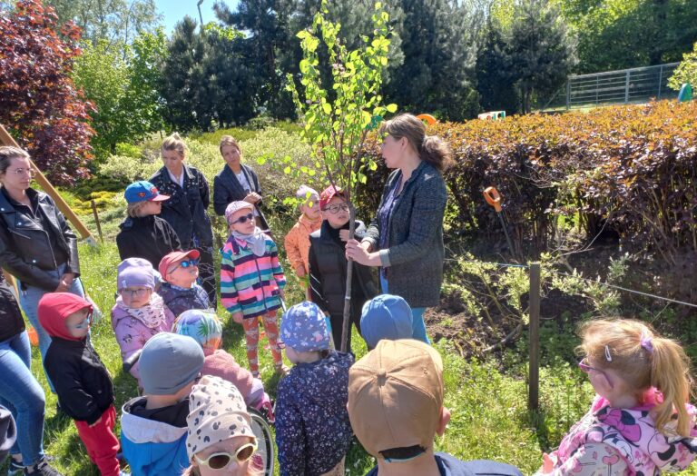 Przedszkolaki sadziły drzewno migdałowe w naszym ogrodzie.