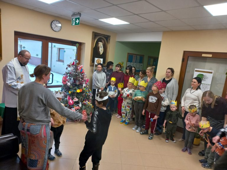 Królowie i królewny w poszukiwaniu małego Jezusa przeszli całe Przedszkole, Wczesne Wspomaganie, Szkołę,śpiewając kolędy i grając na instrumentach.a Ksiądz Paweł poświęcił wszystkie pomieszczenia … aż kres naszej podróży nastąpił w Kaplicy.
