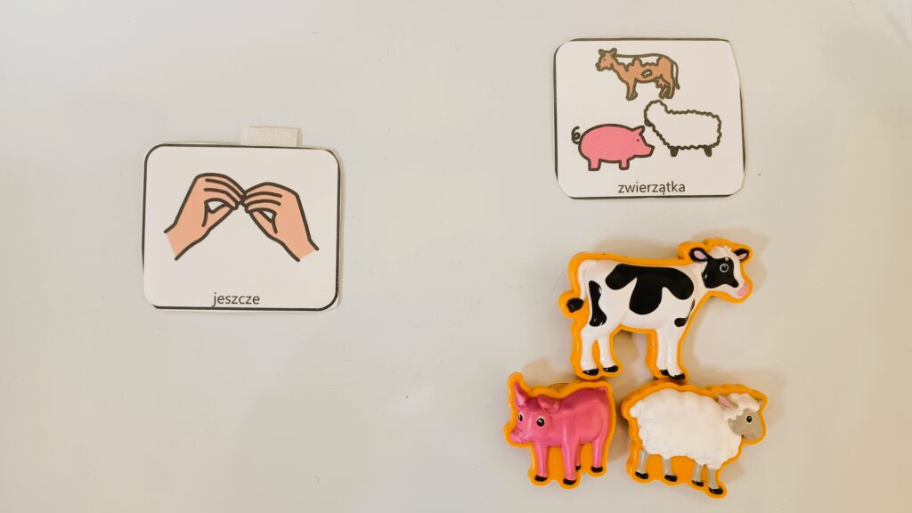 Z kolei budowanie systemu komunikacyjnego zawsze wiąże się z pracą na konkretach. Rozwijanie mowy czynnej to na przykład wprowadzenie wyrazów dźwiękonaśladowczych, które odnoszą się do wszystkich zabawek/czynności. PRZYKŁAD: Bam! – rzucamy piłką, La! – idziemy po lalę, Mu!– bawimy się krową itd. Budowanie systemu komunikacyjnego to również kształtowanie mowy biernej przez stałe nazywanie